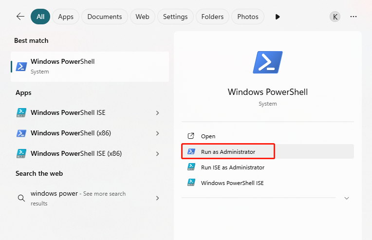 Step 1. Type “Windows PowerShell” in the Windows search and run it as an administrator.
