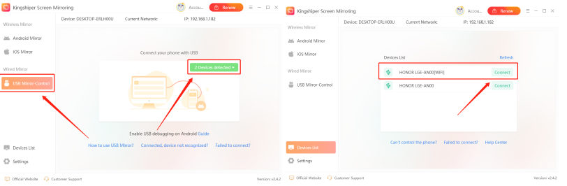 Step 3. Launch Kingshiper software on your computer. Click on the “USB Mirror-Control” > “2 Devices detected” button. Then, you can find your device, and click “Connect” to make a connection between your phone and computer.