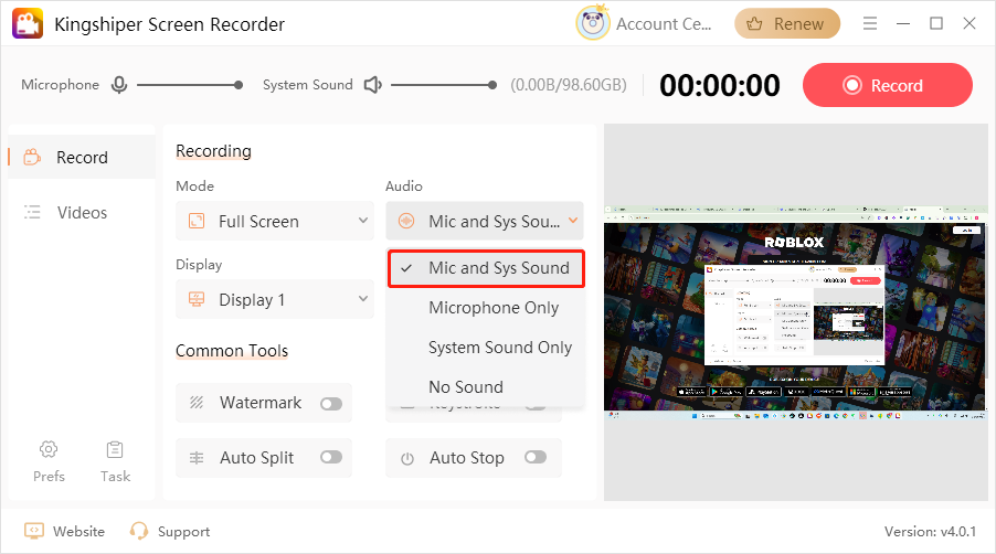 As a result of this, you can use Kingshiper Screen Recorder to record Roblox with your voice, which allows you to record the microphone and system sound during the gameplay. In just three simple steps, you can enjoy creating high-quality, engaging videos that show your gameplay and commentary effortlessly.