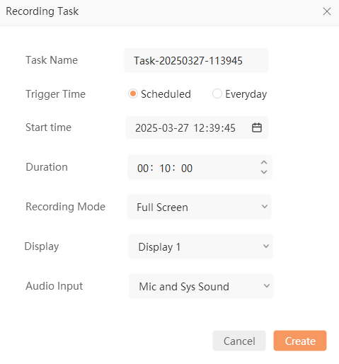 Step 3. Set the Task Name, Trigger Time, Start Time, Duration, Recording Mode, Display, and Audio Input you need to record in the pop-up window.