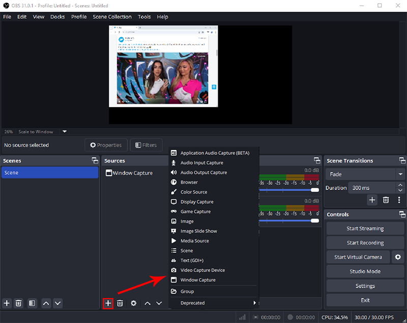 Step 3. In Sources, click "+“ and select Window Capture.