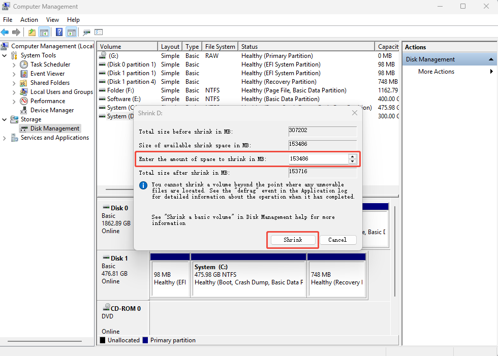 Step 3. Enter the amount of space to shrink based on your available disk space, then click “Shrink”.