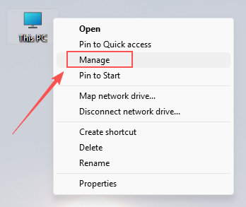 Step 1. Right-click on “This PC” on your desktop and select “Manage”.