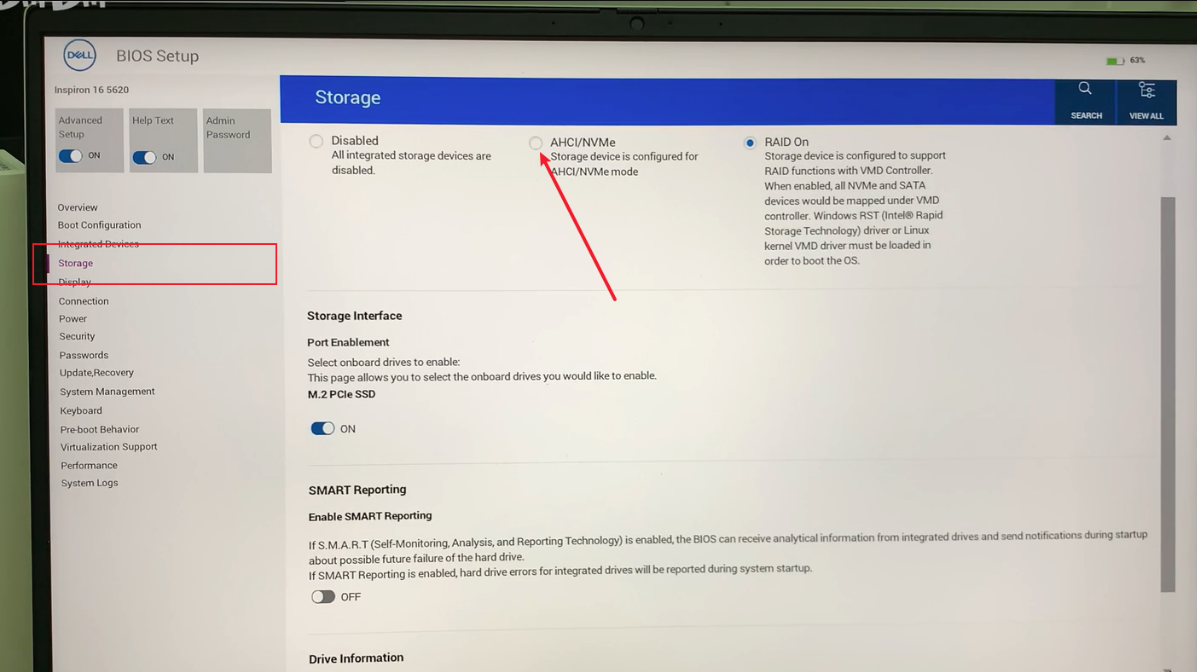 Step 3. Go to the “Storage” and change the hard drive mode from its default setting to AHCI.