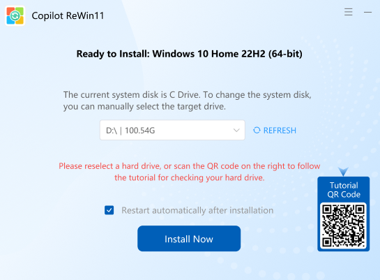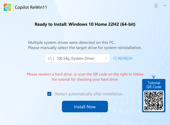 Manually select the target drive for Windows installation. If the drive is not listed, click the “Refresh” button to re-scan available drives.