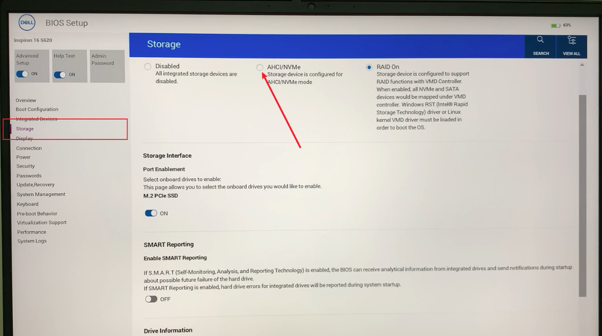 Step 2. In the Storage section, change the hard drive mode from its default (IDE or RAID) to AHCI.