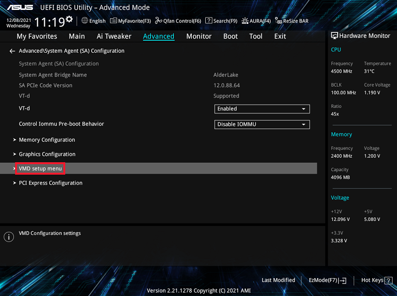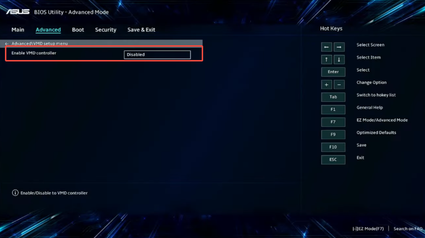Step 4. For systems with Intel VMD technology, navigate to Advanced > Intel VMD Configuration or VMD Setup Menu. Set the VMD Controller to Disabled, which will automatically enable AHCI mode.