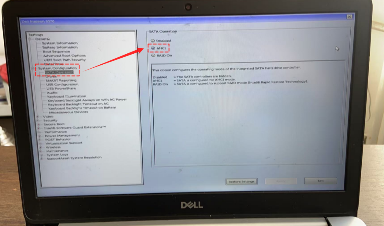 Step 2. Once inside the BIOS, navigate to “System Configuration” and select “SATA Operation”, then change the SATA mode to “AHCI”.