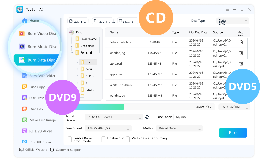 Finally, I have peace of mind knowing my important files are safely backed up. With TopBurn AI, I can burn my data to discs without any worry about data loss.